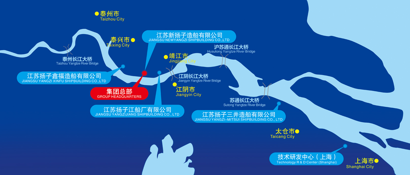 集團公司下轄江蘇新揚子造船有限公司、江蘇揚子鑫福造船有限公司、江蘇揚子三井造船有限公司及江蘇揚子江船廠有限公司4家造船企業(yè),分布于長江下游江蘇省境內的靖江市、泰興市和太倉市的黃金水道兩岸,距上海、南京兩大城市均170公里。
