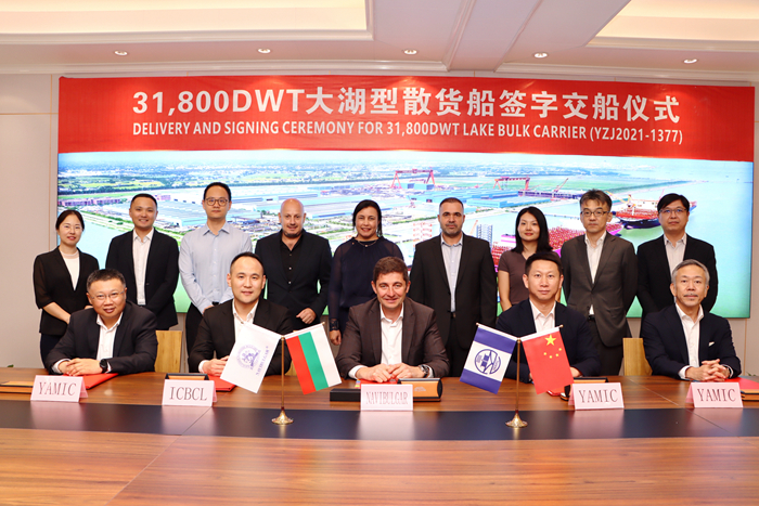 The ship "SLAVYANKA" entered DNV Classification Society and is the eighth ship delivered by Yangzi Mitsui this year. With the successful naming and delivery of the 31800DWT large lake bulk carrier "SLAVYANKA", our group has successfully completed the construction of eight new shipbuilding projects of the same type series for the Bulgarian National Shipping Company (NAVIBULGAR).